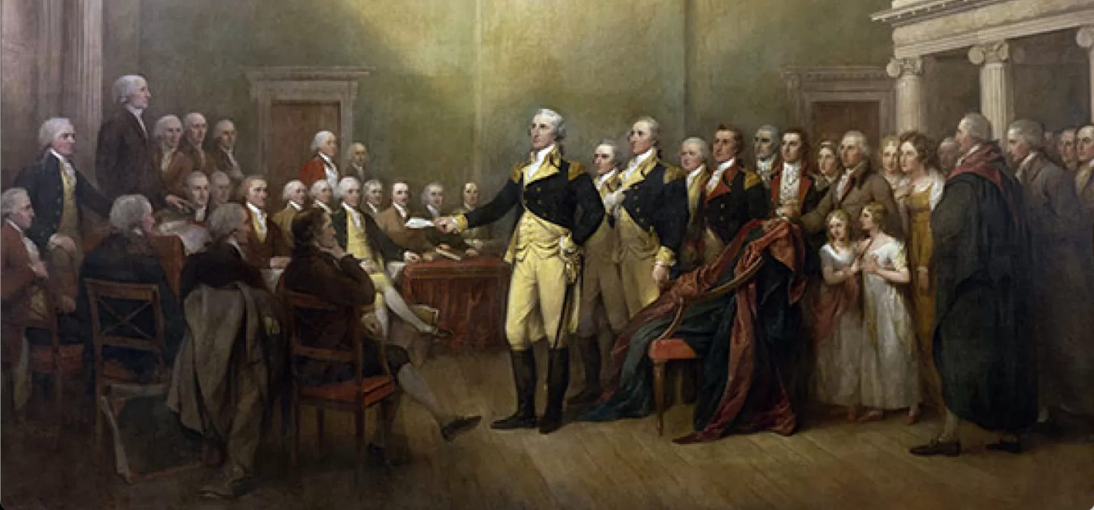 In the John Trumbull painting above, George Washington steps down as Commander-in-Chief of the Continental Army after winning independence from Great Britain.